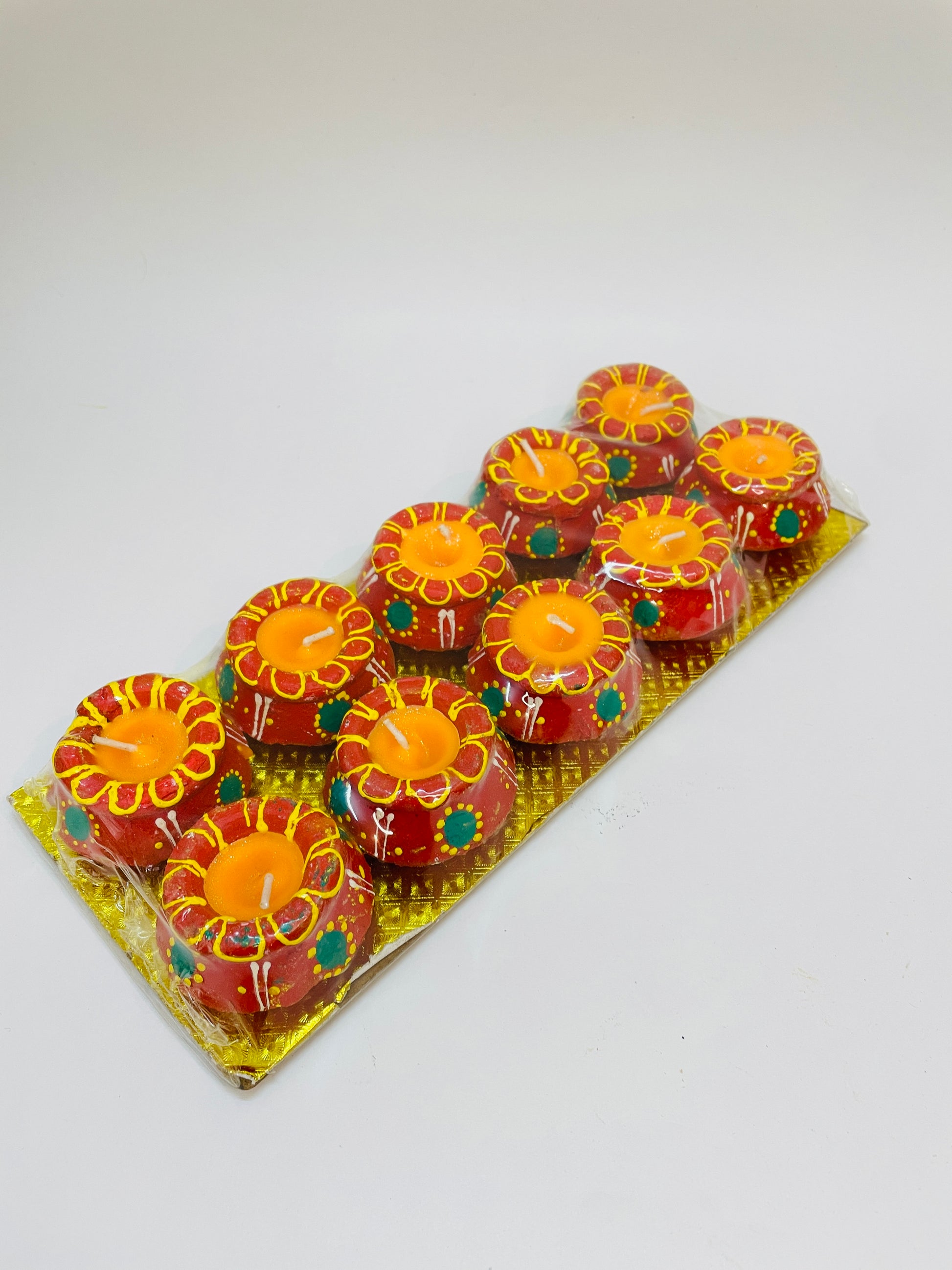 Brighten up your festive celebrations with this beautiful set of 10 handcrafted matki candles. Each candle is designed with vibrant colors, hand-painted floral patterns, and filled with high-quality wax for a clean and long-lasting burn. Perfect to create a warm, welcoming, and festive aura in your home.
