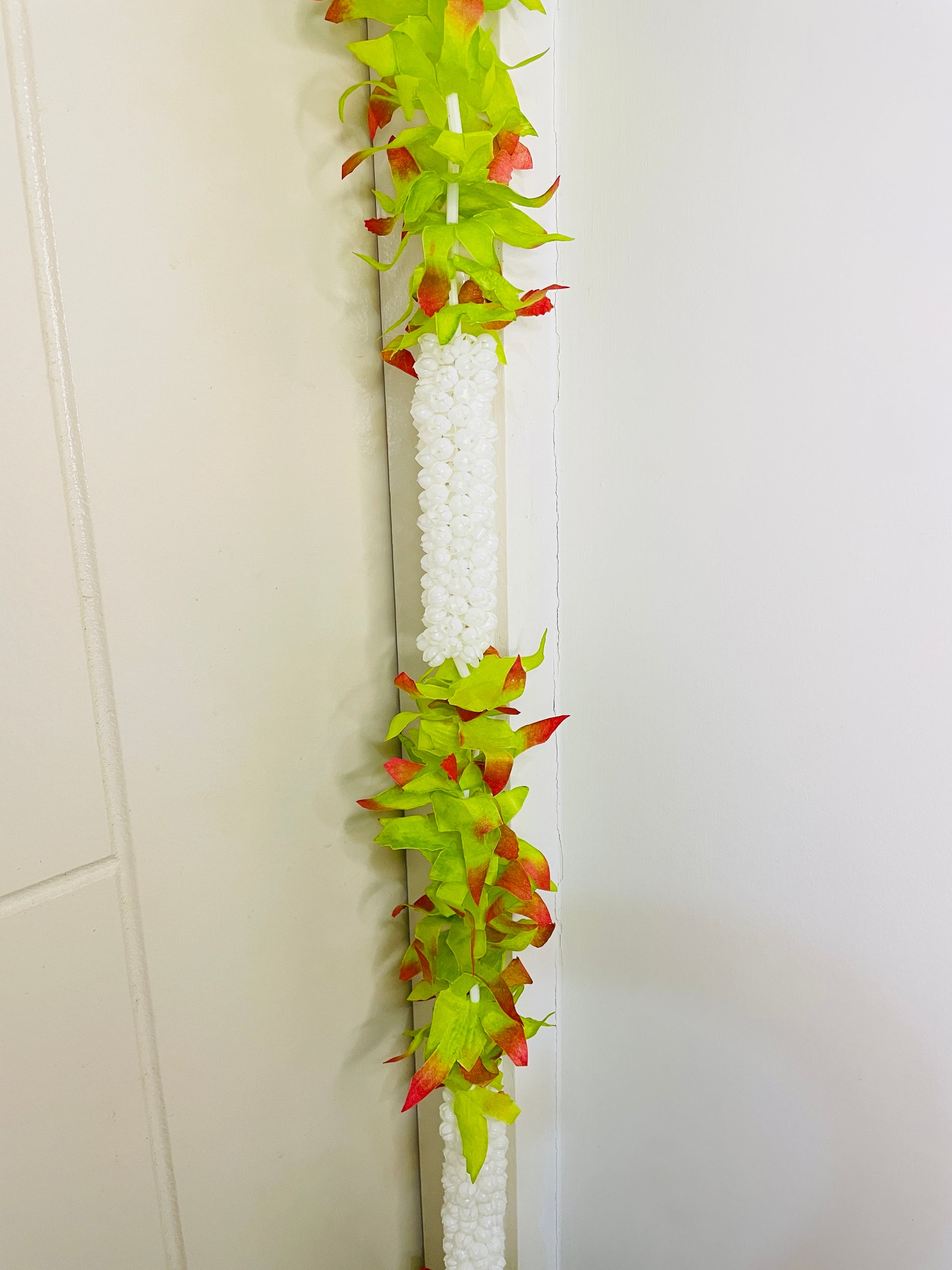 Enhance your festive celebrations with this beautifully handcrafted fabric flower ladi, designed to add elegance and positivity to your home. Made with high-quality durable fabric, this decorative toran is both washable and reusable, making it a long-lasting addition to your festive décor collection. The charming white floral beads paired with vibrant green and red leaves give it a natural yet premium appeal, perfect for occasions like Diwali, Navratri, Weddings, Housewarming, and Pooja decorations.