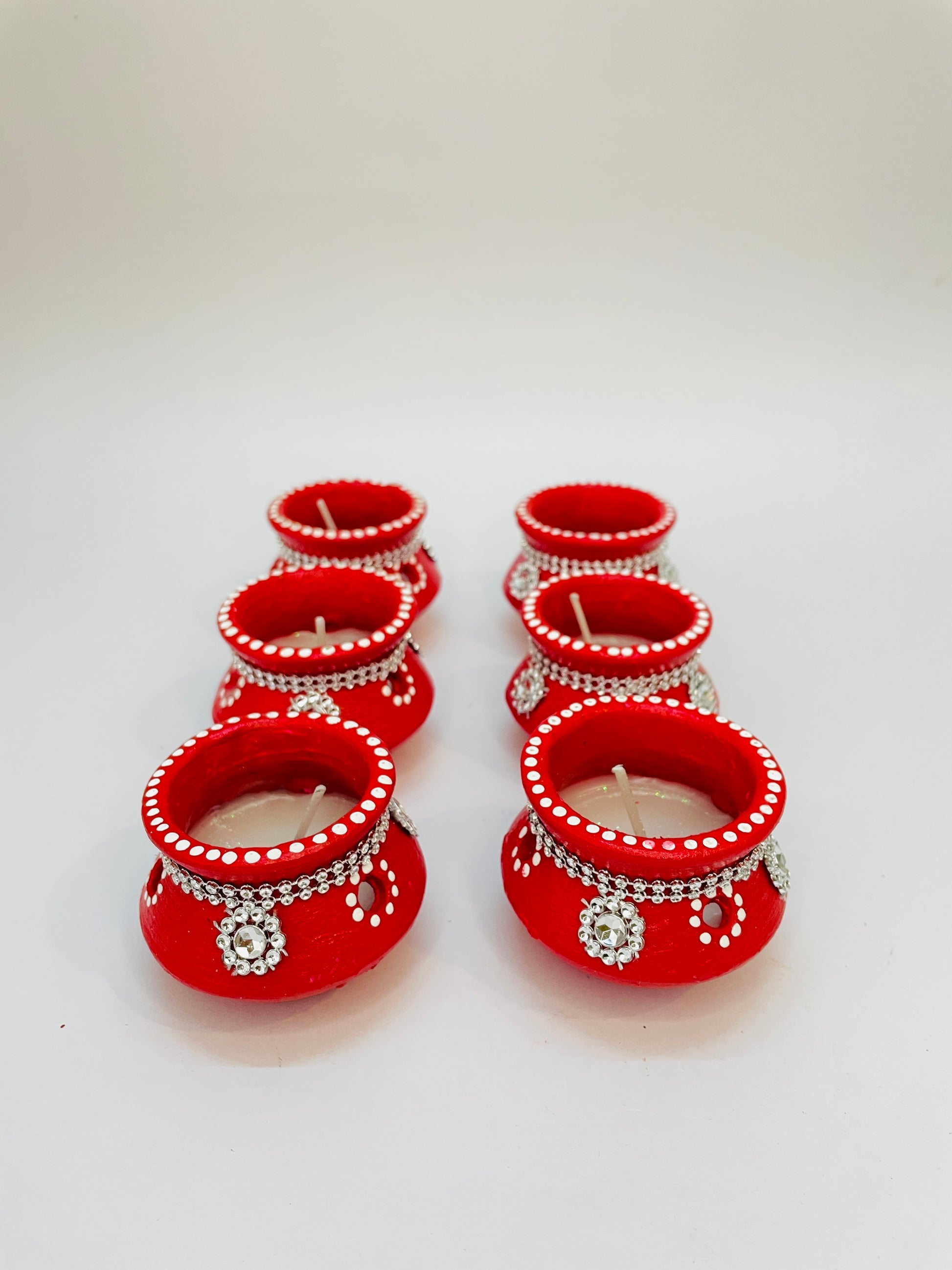Light up your celebrations with these elegant Red Matki Candles, crafted to add warmth and beauty to every occasion. Each candle comes in a traditional matki-shaped holder, hand-painted in red with delicate white dot patterns and decorated with sparkling stone embellishments, making them festive and stylish.