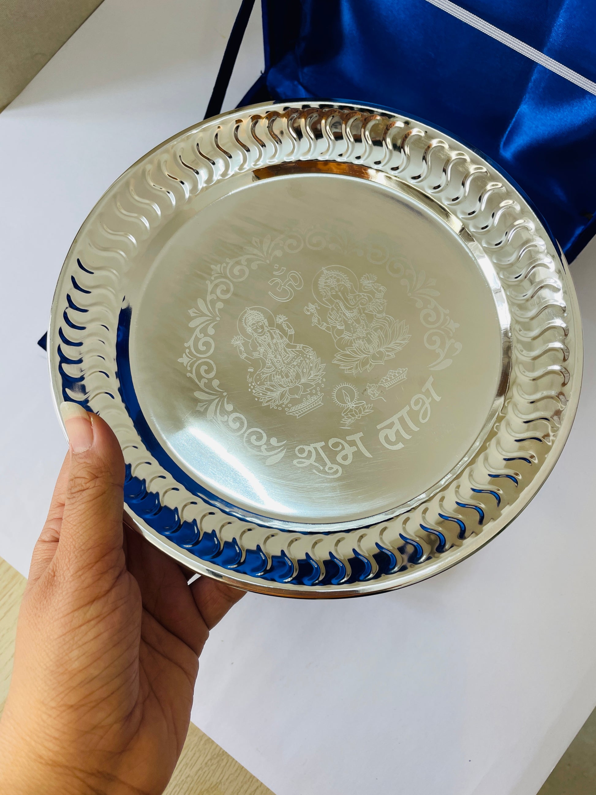Add elegance and devotion to your rituals with this beautifully designed silver-coated pooja thali set, crafted from durable aluminium and engraved with Lakshmi Ji and Ganesh Ji. A true symbol of prosperity and blessings, this thali is perfect for auspicious occasions, festivals, and daily pooja.