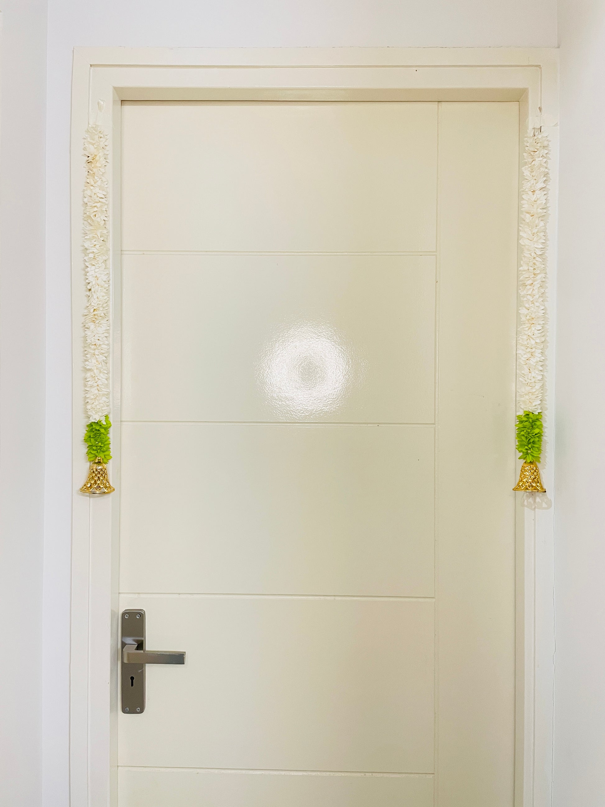 Each 2-foot ladi features crisp white blooms paired with a golden bell, symbolizing peace, devotion, and spiritual harmony. Perfect for decorating idols, doorways, walls, or pooja tables, it adds a sacred and refreshing touch to any setting.